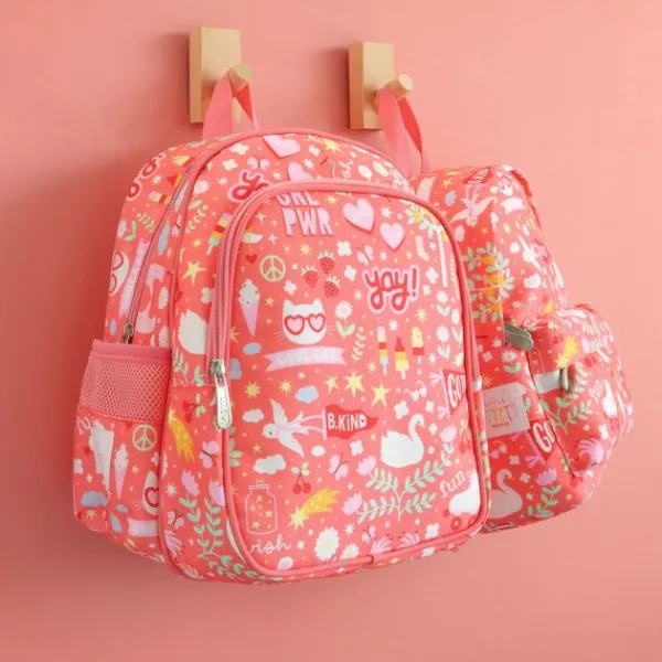 De rugtas heeft een ruim hoofdvak en een extra voorvak, beide met rits, waar je gemakkelijk een lunchbox, drinkbeker en favoriete speelgoed in kwijt kunt. Aan de zijkanten zitten handige mesh vakjes voor een drinkfles. Dankzij de gewatteerde, verstelbare schouderbanden is de tas comfortabel te dragen voor kleine ruggetjes.