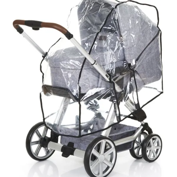 De regenhoes past zowel over de kinderwagenbak als over het wandelwagenzitje.