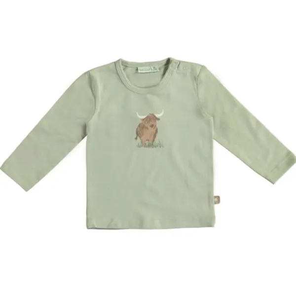 De charmante Highland‑cow print geeft een warme, natuurlijke uitstraling – perfect te combineren met een simpele legging of broekje voor een complete look.