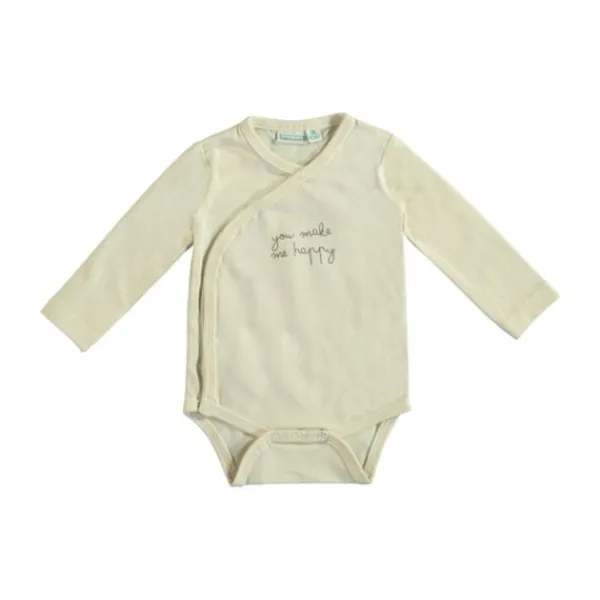 De Babylook Overslag Romper in zachte buttercream kleur met lieve “you make me happy”-opdruk is een charmante keuze voor de allerkleinsten. Dankzij de omslagstructuur met drukknopen is deze romper ideaal vanaf de eerste dag.