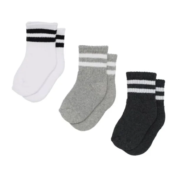 Deze set bestaat uit drie paar sokjes in neutrale tinten: wit met zwarte strepen, lichtgrijs met witte strepen en donkergrijs met witte strepen. De sportieve dubbele streep aan de bovenkant geeft een stoere uitstraling die past bij iedere outfit. Ideaal voor dagelijks gebruik en makkelijk te combineren.