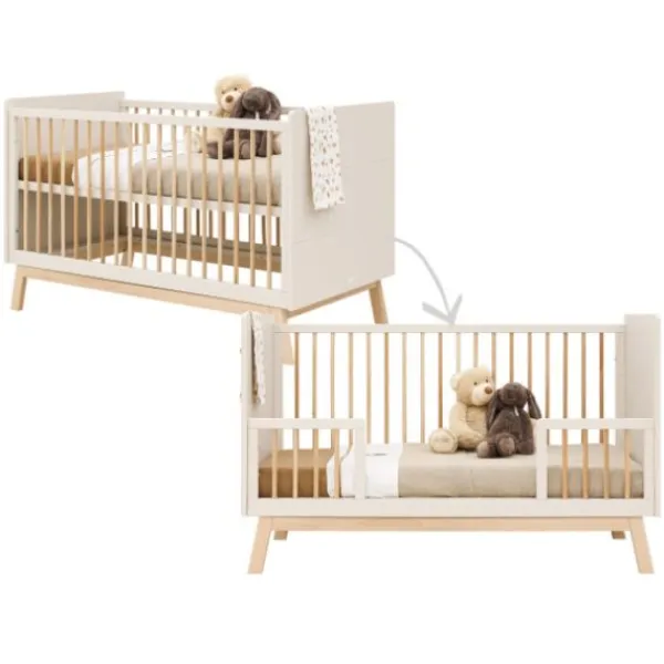 Dit ruime babybed (70 x 140 cm) van de serie Lines van Bopita is om te bouwen van een babybed met spijlen, naar een peuter bedbank zodat de kleine zelf kan in- en uitstappen en hieraan kan wennen.