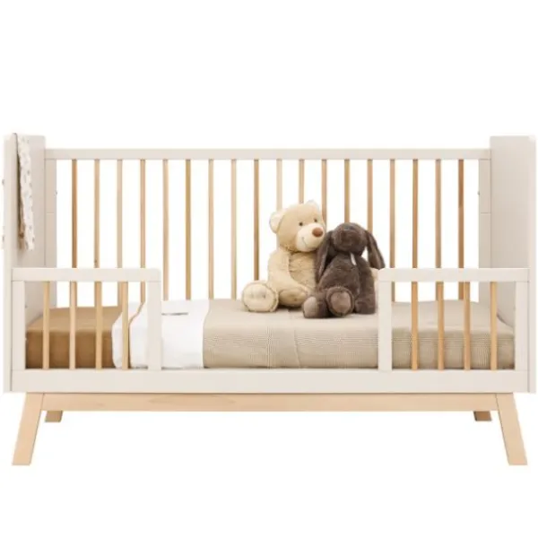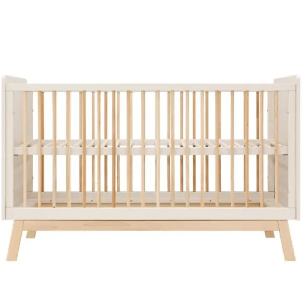 De bedbodem is in twee hoogtes verstelbaar. De eerste maanden gebruik je de bedbodem in de hoogste stand. Zodra het kindje zich zelf kan optrekken aan de spijlen, plaats je de bedbodem in de laagste stand. Zo blijft het bed een veilige slaapplek.