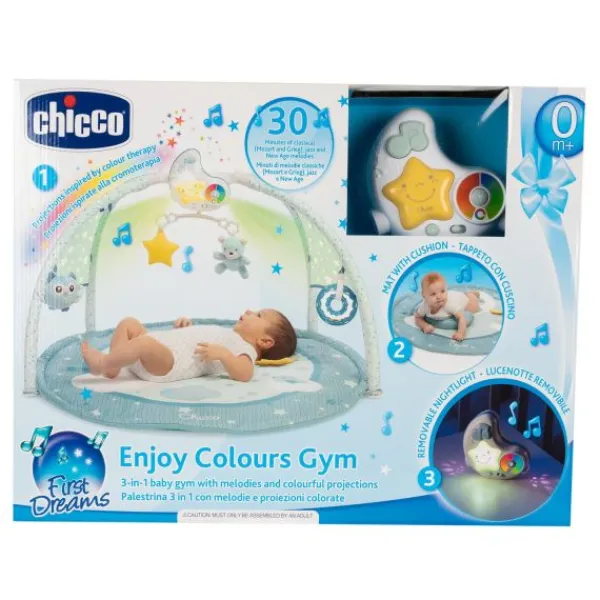 Deze vrolijke Babygym Kleurenplezier is een 3-in-1 gym met keurrijke projecties en leuke melodieën, geïnspireerd op cromotherapie. De innoverende babygym is geschikt om te ontspannen tijdens het dagelijkse leven. De 83 cm ronde speelmat heeft een kussentje voor de buik. De maanvormige projector is verwijderbaar en kan daardoor gebruikt worden als nachtlampje. De projecties en melodieën zijn aan te passen op de speel- en ontspantijd van je baby. Kies tijdens speeltijd voor de fun-modus. Hierin krijgt je baby warme kleuren en vrolijke jazzmuziek. Tijdens de entertainment- modus speelt de babygym New Agemelodieën en warme en koele kleuren voor een veelkleurige ervaring. Tot slot is er een relax-modus. Hierin kan je baby heerlijk ontspannen door middel van klassieke muziek en koele kleuren.