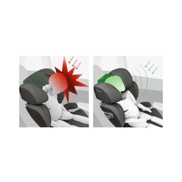 De gepatenteerde verstelbare hoofdsteun kantelt het hoofdje van het kind iets naar achteren en helpt zo te voorkomen dat het tijdens het slapen naar voren valt. Dus bij een botsing van opzij is de kans groter dat het hoofdje van je kind zich in een beschermde positie bevindt – zeven keer veiliger dan wanneer het uit de veiligheidszone van het zitje zou vallen