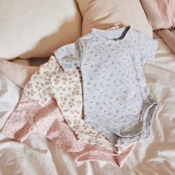 Deze super leuke 3-pack rompers zijn van het merk Dirkje. Twee van de rompers hebben een schattige bloemenprint en een romper is roze met zwarte stipjes.