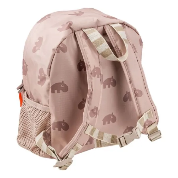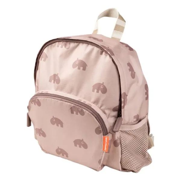 De rugzak heeft een grote ruimte waar gemakkelijk een lunchtrommel, kleding en alle eigenzinnige vondsten in passen die je kind onderweg meeneemt. Het heeft twee zijzakken met elastische band voor een fles en een voorvak.