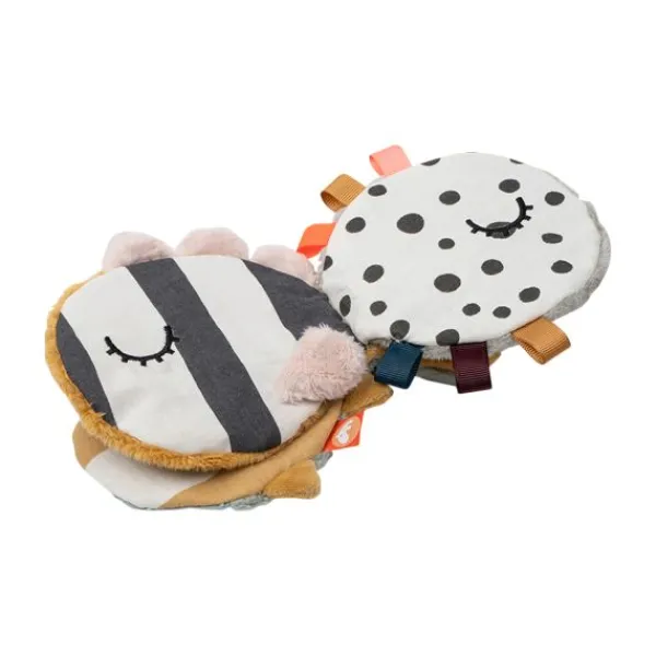 Kleine vingers kunnen genieten van verschillende texturen en zich vastgrijpen aan de zachte spikes en kleurrijke tags. Sla de pagina om en hoor een lief kreukelgeluid, terwijl nieuwsgierige ogen geboeid worden door stippen en strepen in contrasterende kleuren die de nieuwsgierigheid van je baby stimuleren.