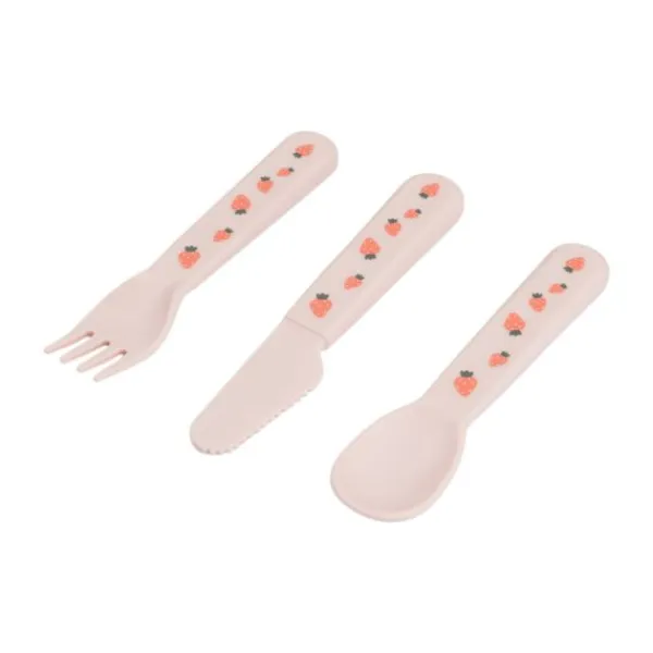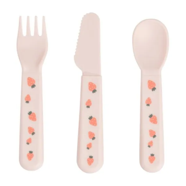 Maak etenstijd extra leuk met het **Done By Deer Tiny Farm Bestek – Powder**! Dit schattige besteksetje is speciaal ontworpen voor kleine handjes en helpt je kindje zelfstandig te leren eten. De set bestaat uit een vork, mes en lepel, allemaal met een speels aardbeienontwerp op het handvat. Dankzij het ergonomische ontwerp ligt het bestek prettig in de hand en is het eenvoudig vast te houden door je kleintje.