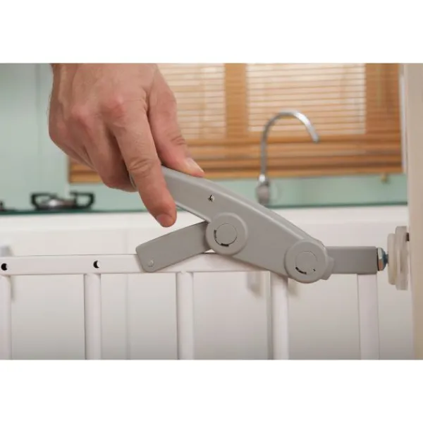 Het hekje is voorzien van een sluiting waarbij 2 handelingen nodig zijn om het hek te kunnen openen. Voor volwassenen is het hekje met 1 hand te openen.