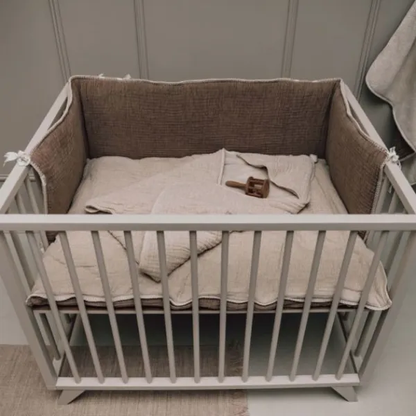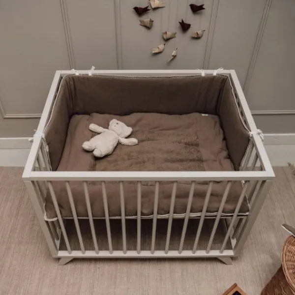 Het is gebruikelijk dat de box zich in de woonkamer bevindt, daarom is het prettig als je de accessoires voor de box qua kleur en stof kunt laten aansluiten bij je interieur. De voornaamste functie van deze boxbumper is natuurlijk het bieden van bescherming tegen tocht en het voorkomen van stoten tegen de spijlen van de box. Met de bijbehorende koordjes kun je de bumper eenvoudig aan de spijlen van de box bevestigen. Over de gehele breedte van het kussen zijn meerdere bevestigingskoordjes aangebracht, zodat deze gelijkmatig verdeeld en stevig vastgemaakt kan worden.