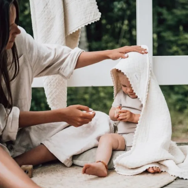 Met de ophanglus hangt de doek altijd binnen handbereik in de bad- of babykamer. Neem je omslagdoek ook mee naar het consultatiebureau; ideaal voor als je nog even op je afspraak wacht.