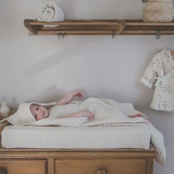 De Koeka omslagdoek met capuchon is met stretch badstof gevoerd en gebruik je om je baby in te wikkelen. Deze omslagdoek is voorzien van een opening zodat de doek ook met de gordels van de auto- of wipstoel gebruikt kan worden. Zo blijft je kleintje altijd comfortabel warm, zowel in huis als onderweg. De omslagdoek is ook fijn om te gebruiken tijdens het voeden. Met de ophanglus hangt de doek altijd binnen handbereik in de bad- of babykamer.