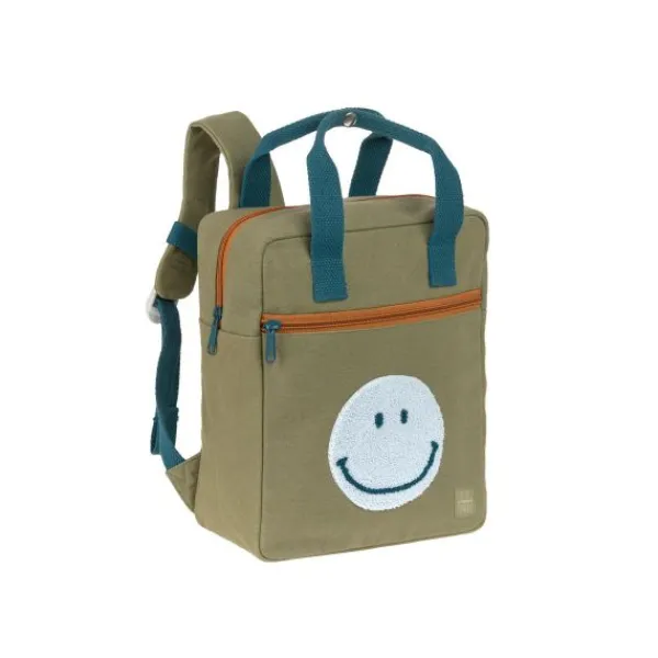 De rugzak is groen van kleur en heeft een super toffe applicatie van een smiley in lichtblauw. De bruine ritsen en donkere hengsels maken de tas helemaal af. Ideaal voor mee naar de oppas, het kinderdagverblijf of als ze wat groter zijn om mee naar school te nemen!