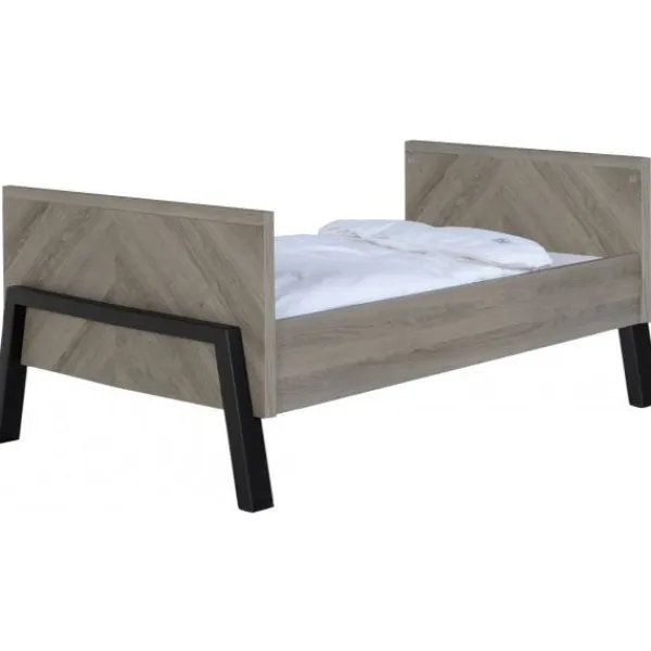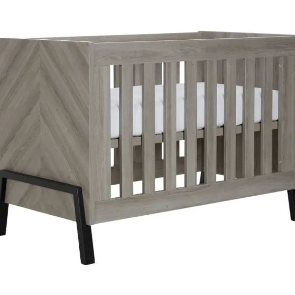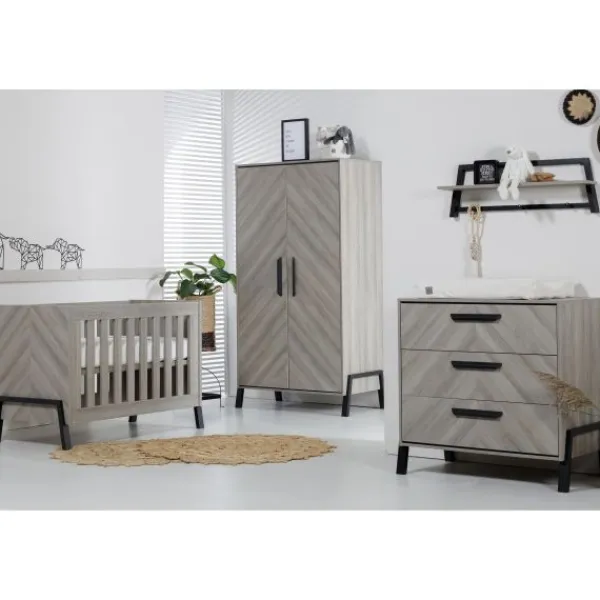 Babykamer Havana van het merk TWF is een echte eye catcher! Deze stoere kamer heeft een prachtig vissengraatmotief gecombineerd met zwarte houten poten dat je kamertje helemaal trendy maakt. Een extra leuk detail zijn de zwarte houten handgrepen op de commode en kledingkast.