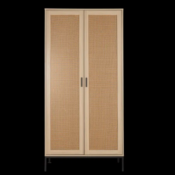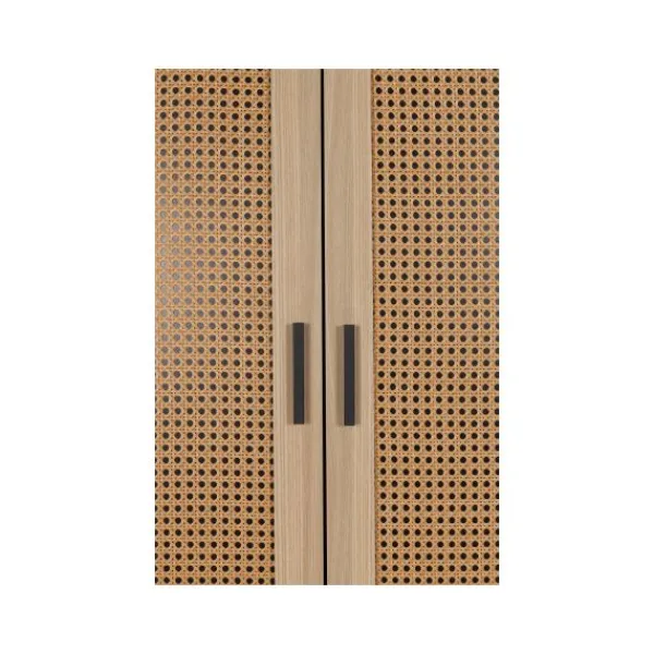 De combinatie van meubelplaat met MDF onderdelen voorzien van fineer met een houtpatroon geven de kamer een moderne look. Dit in combinatie met de Rotan delen en zwart gelakte metalen poten geeft een extra stoere look aan de kamer.