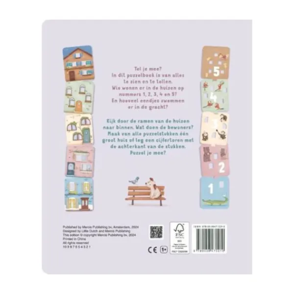 In dit puzzelboek van het merk Little Dutch is van alles te zien en te tellen. Wie wonen er in de huizen op nummers 1, 2, 3, 4, en 5? Hoeveel ramen tel je in elk huis? Tel een hoeveel hondjes er aan het spelen zijn.