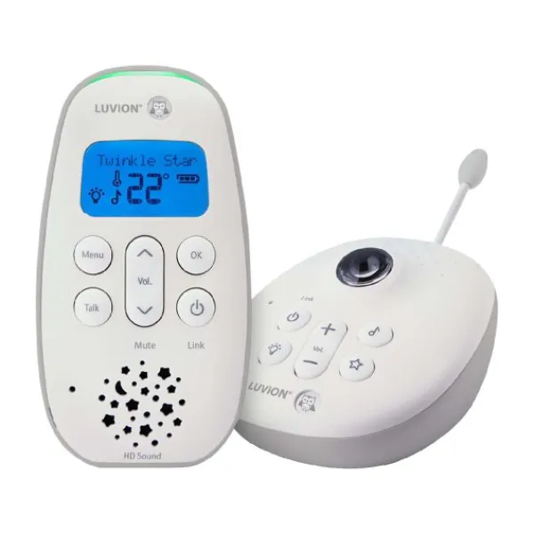 De Icon Clear 75 Pro set van het merk Luvion beschikt over HD-audio voor een optimale verbinding en kan verschillende rustgevende slaapliedjes voor de baby afspelen. Het heldere display met blauwe achtergrondverlichting geeft de kamertemperatuur weer.