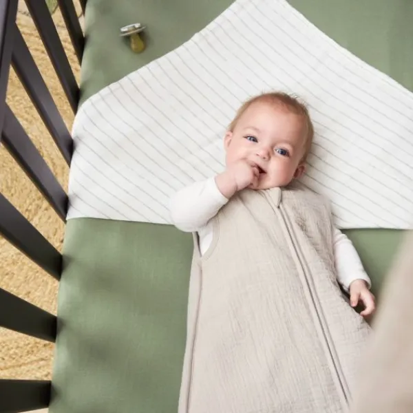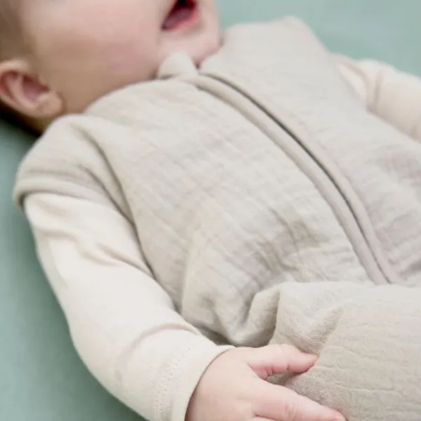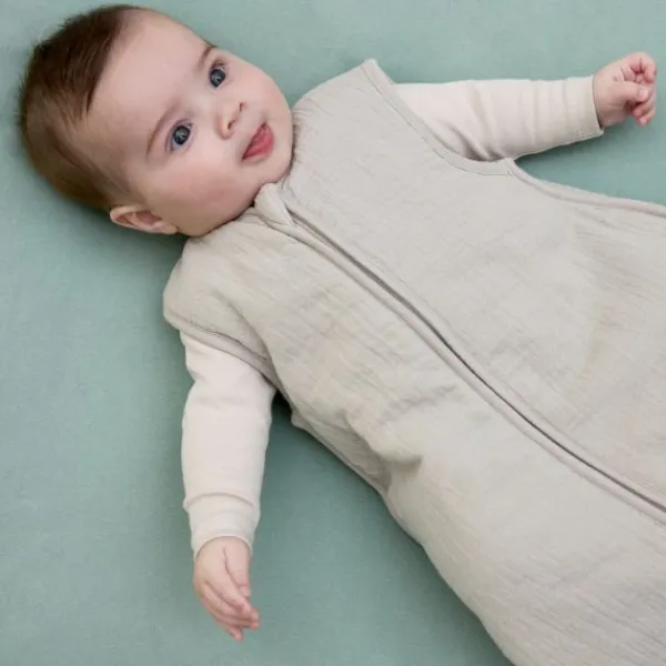 De slaapzak heeft een tijdloos design in de kleur Greige en is voorgewassen voor extra zachtheid. De vulling van polyester zorgt voor een lichte warmte, terwijl de hydrofiele buitenkant vocht goed absorbeert en snel droogt. De veilige pasvorm met een rits over de hele lengte maakt het makkelijk om je kindje in en uit de slaapzak te halen. Hierdoor blijft je baby de hele nacht op temperatuur zonder losliggend beddengoed.