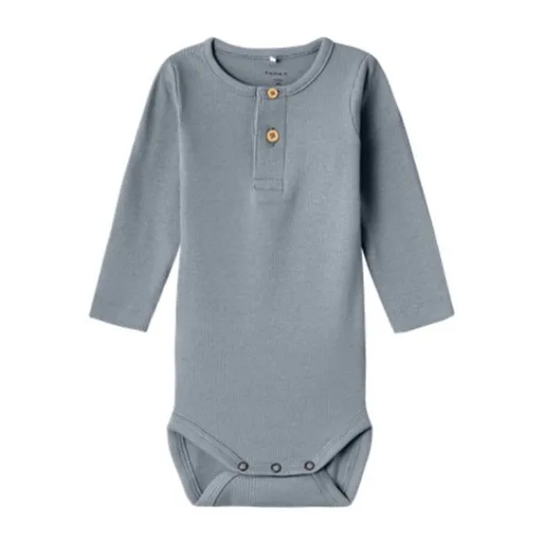 De Name It Kab Button Romper NOOS – Tradewinds in maat 56 is een zachte, comfortabele romper voor pasgeboren baby’s. Gemaakt van een hoogwaardige katoen-modal mix met elastaan, biedt deze romper voldoende stretch en een fijne pasvorm. De lange mouwen en ronde hals zorgen voor warmte en comfort vanaf dag één. De houten sierknopen op de borst geven de romper een stijlvolle twist, terwijl de handige drukknoopsluiting onderaan zorgt voor gemak tijdens het verschonen. De kleur Tradewinds – een zachte blauwgrijze tint – maakt deze romper een stijlvolle basic.