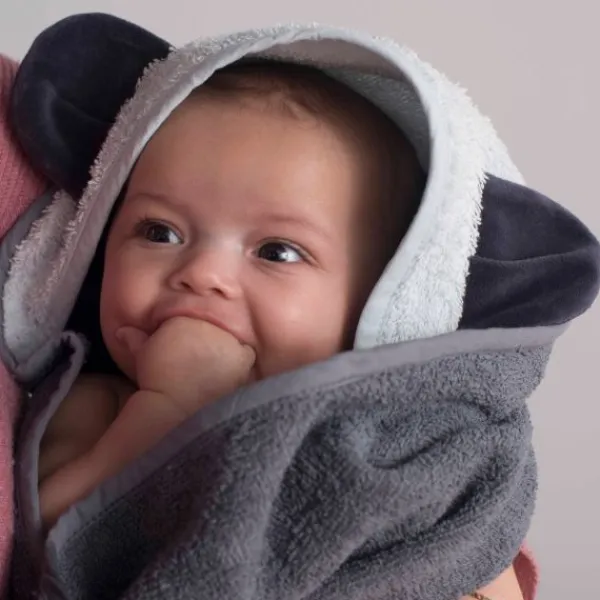 Het pootje gooi je over je schouder. Hierdoor komt de badcape voor je te hangen. De badcape hangt nu meteen klaar én je hebt beide handen vrij om je baby na het badderen snel en gemakkelijk lekker warm in te wikkelen.