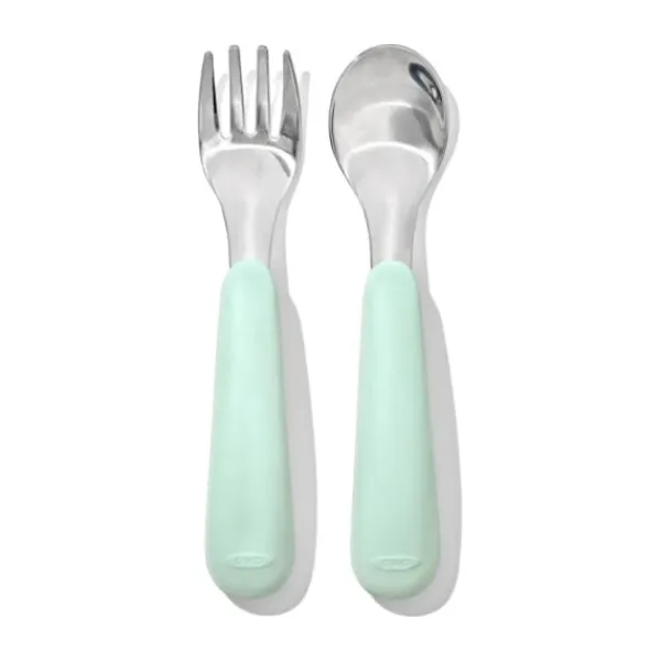 De vork en lepel hebben dikke handgrepen met antislip die perfect in kleine handjes liggen. Doordat de handgrepen niet helemaal rond zijn, rolt het bestek niet op de grond en glijdt het niet in de kom of het bord.