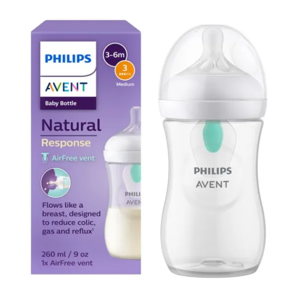 Met de Philips Avent fles natural response airfree 260ml kun je kalm en comfortabel voeden. De Natuurlijke Zuigreflex-speen volgt het unieke ritme van je baby voor zuigen, doorslikken en ademen. Het airfree-ventiel is ontworpen om ondertussen lucht weg te houden uit de buik, om krampjes, gas en brandend maagzuur te voorkomen.