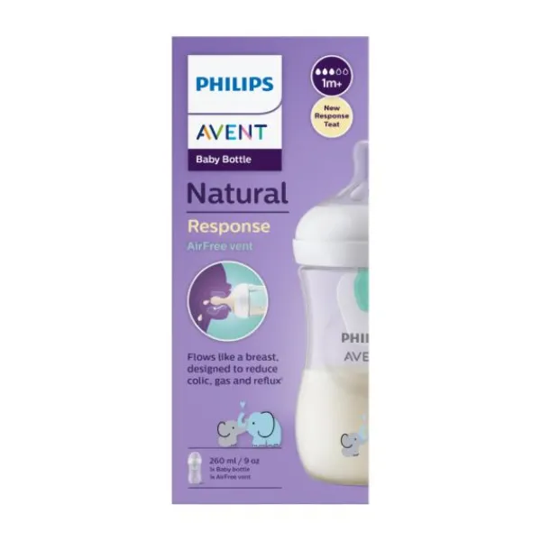 Met de Philips Avent Fles natural response airfree 260ml kun je kalm en comfortabel voeden. De natuurlijke zuigreflex-speen volgt het unieke ritme van je baby voor zuigen, doorslikken en ademen. Het AirFree-ventiel is ontworpen om ondertussen lucht weg te houden uit de buik, om krampjes, gas en brandend maagzuur te voorkomen.