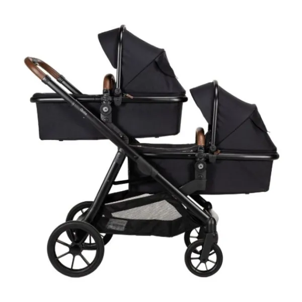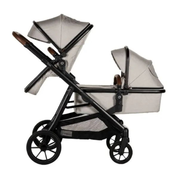 De kinderwagen wordt geleverd met twee reiswiegen en twee zitjes, waardoor hij geschikt is vanaf de geboorte tot een gewicht van 22 kg per kind. De omkeerbare zitjes bieden flexibiliteit, zodat je kinderen zowel naar jou als naar de wereld kunnen kijken.