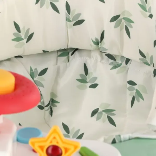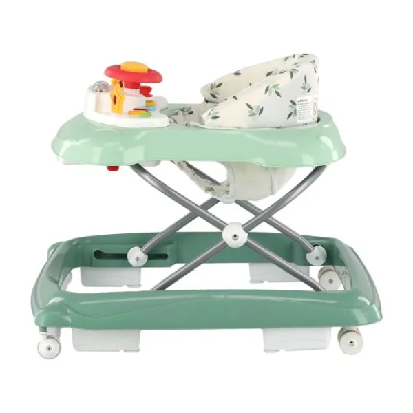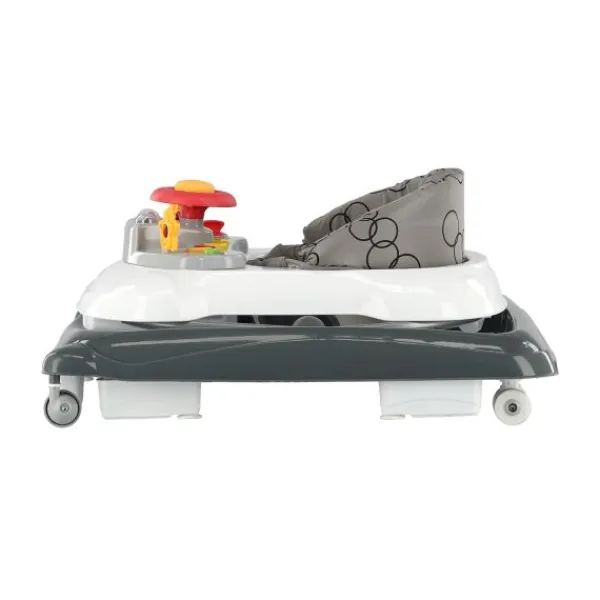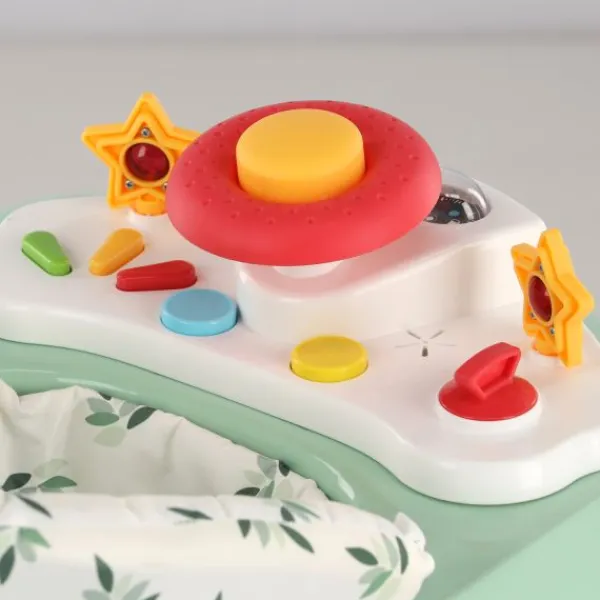 De loopstoel is voorzien van twee zwenkwieltjes en veilige rubber-stops, wat zorgt voor stabiliteit en veiligheid. Het speelblad bevat een stuurtje, diverse speeltjes en een vrolijk muziekje dat eenvoudig kan worden in- en uitgeschakeld via de knop aan de onderkant van het speelblad. Zelfs zonder muziek blijft er genoeg te ontdekken en te spelen!