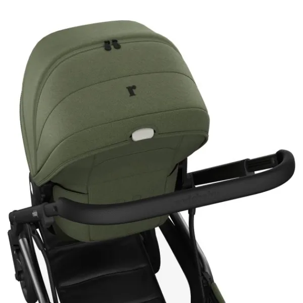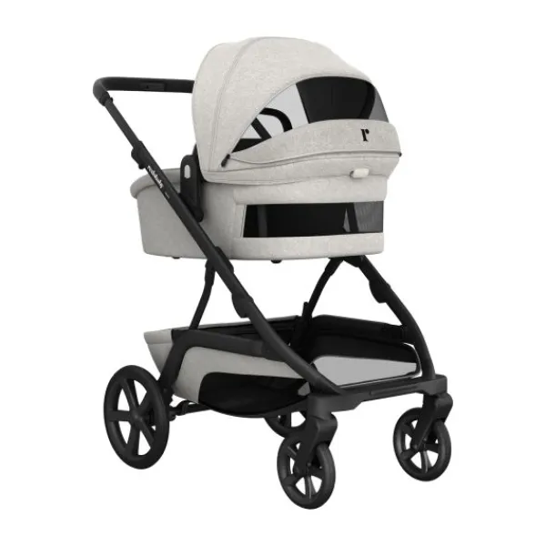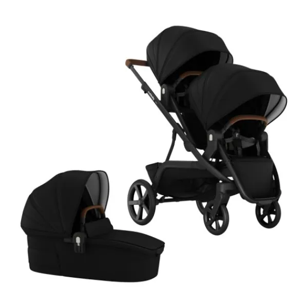 Gebruiksgemak staat centraal: de kinderwagen is opvouwbaar met zitjes bevestigd (in dubbele of enkele modus, zowel parent- als world-facing), het stuur is telescopisch (96–106 cm), en beide zitjes en reiswiegen zijn met één hand te verwijderen. De extra grote mand (12 kg draaggewicht) is vanaf beide kanten toegankelijk. Vergrendelbare zwenkwielen vooraan en visuele indicators tonen wanneer alles veilig vastzit.