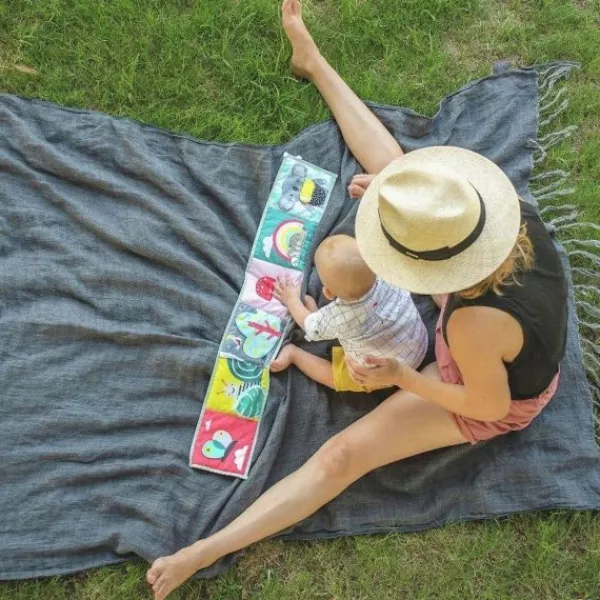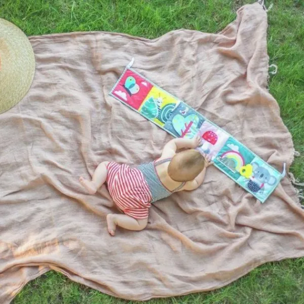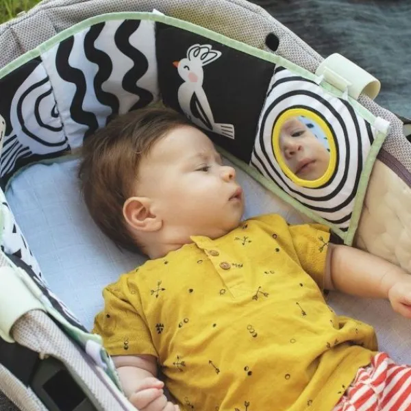 Dit leuke ontdekkingsboekje van Taf Toys heeft 2 zijden voor 2 verschillende ontwikkelingsfases van het kind. Fase 1 (0-3 maanden): contrastrijke kleuren en patronen, babyveilige spiegel en getekende gezichten voor visuele stimulatie om de zintuigen en emotionele intelligentie van de baby te ontwikkelen. Fase 2 (3 maanden+): rijke kleuren, texturen, grappige illustraties en bijtring om de fijne motoriek van de baby te ontwikkelen. Dit boekje is geschikt voor gebruik in de wieg, kinderwagen of op de speelmat. Het boekje wordt geleverd met twee plastic clips voor eenvoudige bevestiging.