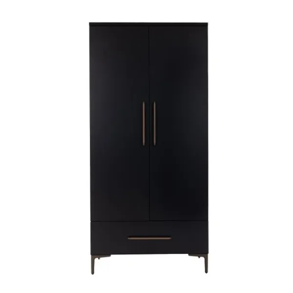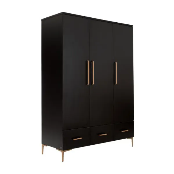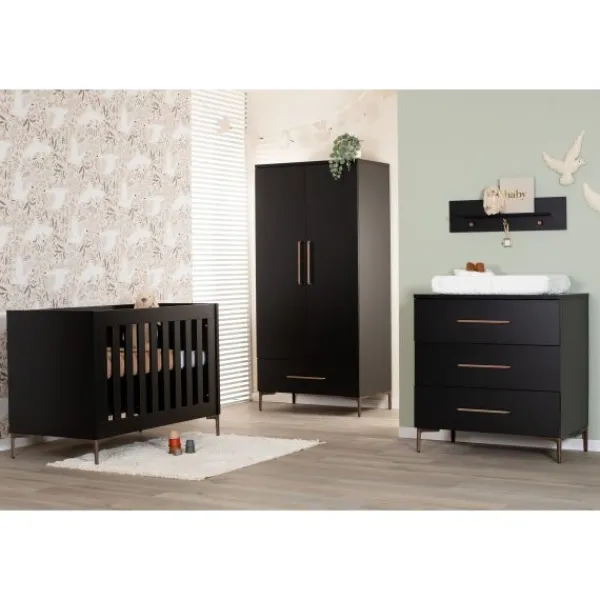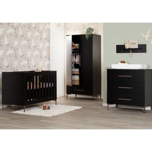 Creëer een stijlvolle en moderne babykamer met de TWF Modena Metaal collectie! Deze complete set, met een ledikant, commode en hanglegkast, heeft een modern zwart ontwerp dat prachtig wordt aangevuld door metalen details. Het minimalistische ontwerp geeft de kamer een tijdloze en luxe uitstraling, perfect voor diverse interieurstijlen. De set zorgt niet alleen voor een rustige sfeer, maar biedt ook praktische oplossingen voor het opbergen van al je babybenodigdheden. De bodem van het ledikantje is verstelbaar in drie verschillende hoogtes, zodat je kindje altijd op de juiste hoogte ligt. De commode biedt voldoende opbergruimte om je kindje te verschonen. Zo beschikt de commode over drie lades waarin je de spulletjes van je kindje gemakkelijk kunt opbergen. De kast beschikt ook over voldoende opbergruimte. Binnenin de kast bevinden zich namelijk 2 legplanken en een hangstang en daarbij bevat de kast ook een lade. Ook beschikken de kastdeuren over soft-closing, hierdoor kunnen de deuren geruisloos geopend en gesloten worden. Zowel het ledikantje, de commode en de kast zijn gemaakt van hoogwaardig materiaal, namelijk een combinatie van plaatmateriaal dat is afgewerkt met PVC-randen. Combineer met andere items uit de Modena-collectie voor een stijlvol geheel!