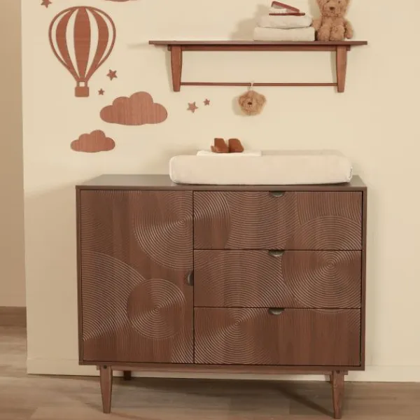 De bijbehorende commode heeft drie ruime lades en één deur met daarachter een legplank. Dankzij het soft-close systeem sluit alles geruisloos en veilig. De bovenkant van de commode biedt voldoende ruimte voor een aankleedkussen, zodat je jouw baby gemakkelijk kunt verzorgen. Het 3D-patroon loopt mooi door over de lades en deuren, wat de commode een luxe en samenhangende uitstraling geeft.