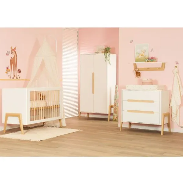 Het ledikant heeft een verstelbare bodem met drie hoogtestanden, zodat je het bed eenvoudig kunt aanpassen naarmate je baby groeit. De massief houten spijlen zorgen voor een stevige en veilige slaapplek. De commode biedt met drie ruime soft-close laden voldoende opbergruimte voor luiers, kleertjes en andere benodigdheden. De linnenkast is uitgevoerd met 2 legplanken en een roede. Door de verhoogde romp van zowel het ledikant de commode en de kast kan je gemakkelijk onder de meubels stofzuigen, wat zorgt voor een schone en hygiënische omgeving.