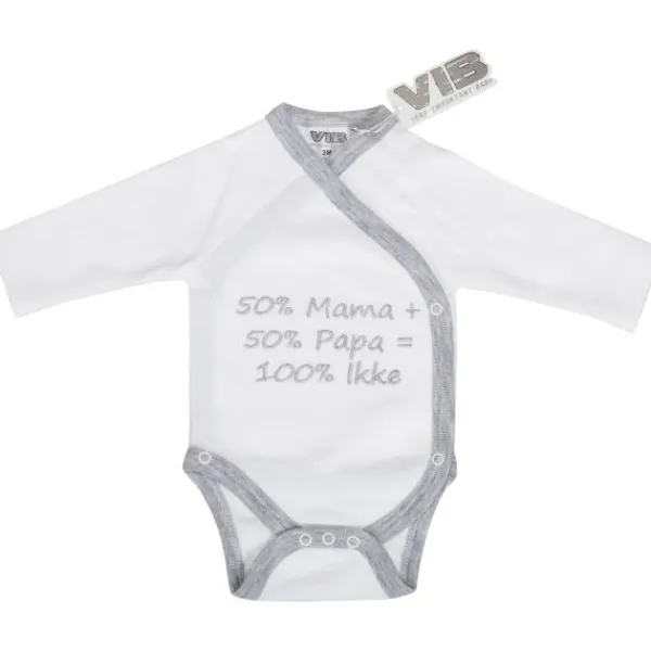 Deze leuke romper is van het merk VIB®. Deze romper is geheel wit van kleur met een grijze bies en heeft een leuke tekst ”50% Mama + 50% Papa = 100% Ikke”.