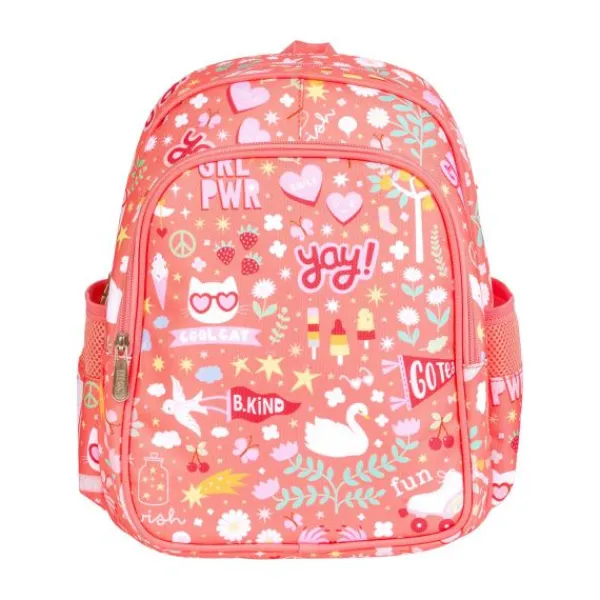De rugtas heeft een ruim hoofdvak en een extra voorvak, beide met rits, waar je gemakkelijk een lunchbox, drinkbeker en favoriete speelgoed in kwijt kunt. Aan de zijkanten zitten handige mesh vakjes voor een drinkfles. Dankzij de gewatteerde, verstelbare schouderbanden is de tas comfortabel te dragen voor kleine ruggetjes.