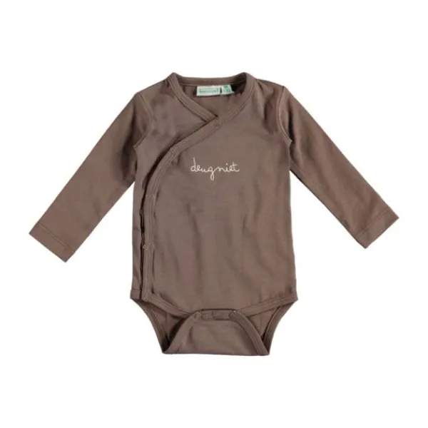 Gemaakt van **95 % katoen en 5 % elastaan**, voelt de romper zacht, ademend en licht elastisch aan. De overslag aan de voorkant maakt het aan- en uitkleden eenvoudig, zelfs bij onverwachte spuitluiers, zonder over het hoofd te hoeven trekken.