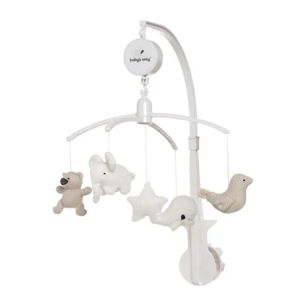 Deze muziekmobiel van het merk Baby’s Only heeft verschillende gebreide diertjes die bestaan uit een beer, olifant, walvis en een vogel.