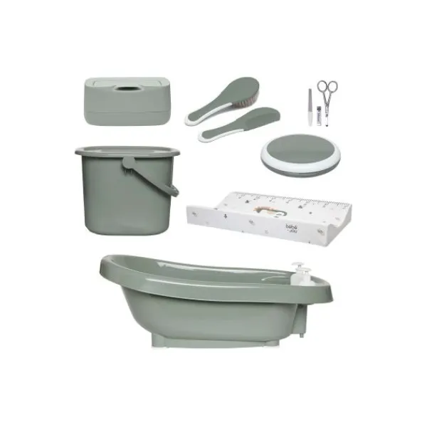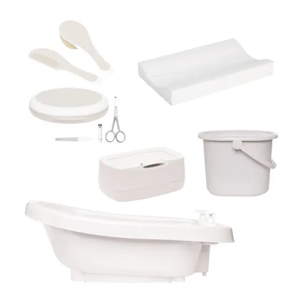 De set bevat een ergonomisch thermobad dat je met het handige CLICK‑systeem snel en stevig kunt bevestigen (in combinatie met een los verkrijgbare badstandaard). Dankzij de stevige constructie en het doordachte ontwerp is badderen comfortabel voor zowel jou als je baby. Bij het bad zit alles om de verzorging compleet te maken: van hygiënische afvalverwerking tot zachte nagel‑ en haarverzorging, en handige accessoires voor bij het verschonen. Zo heb je direct alles bij de hand en verloopt elk moment soepel en overzichtelijk.