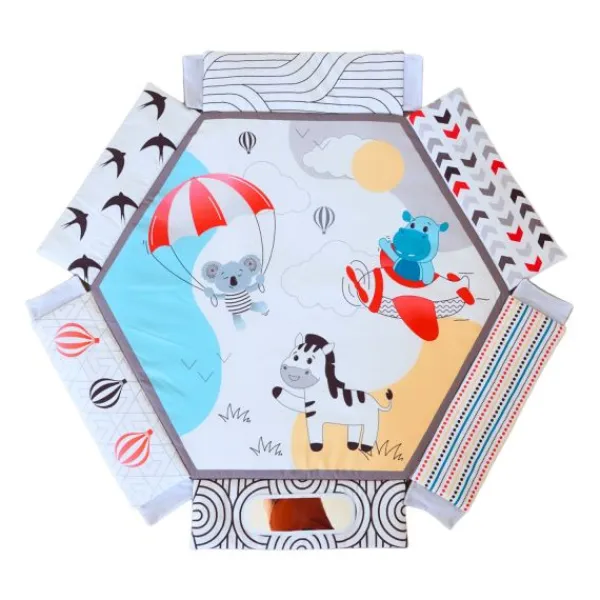 De Bo Jungle Midnight Expedition Play Gym is een zacht en veelzijdig speelkleed dat de ontwikkeling van je baby stimuleert vanaf 0 maanden. Inclusief 30 kleurrijke ballen, rammelaars en een buikkussen. Met vier speelstanden (ruglig, buiklig, kruipen en zitten) groeit dit opvouwbare speelkleed mee met je kindje. De opstaande randen maken er in een handomdraai een veilige ballenbak van. Perfect voor eindeloos speelplezier!