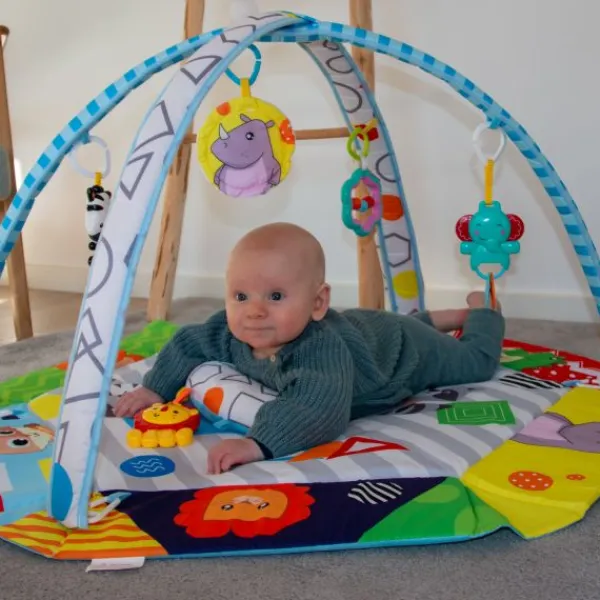 De Tropical Discovery speelgym zit boordevol leuke features zoals een knisperboekje met pieper, rammelaars, een spiegeltje en een comfortabel buikligkussen. Het moedigt je kleintje aan tot ontdekken en zintuiglijke stimulatie in vier verschillende speelstanden. Melodietjes en knipperende lichtjes prikkelen de verbeelding, terwijl de lichtgevende speelboog een magisch tintje toevoegt.