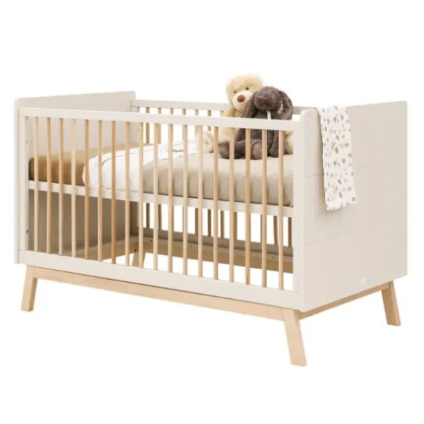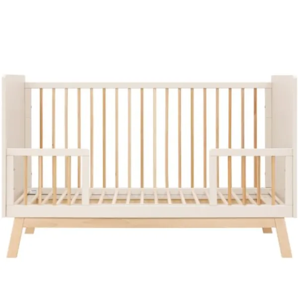 De bedbodem is in twee hoogtes verstelbaar. De eerste maanden gebruik je de bedbodem in de hoogste stand. Zodra het kindje zich zelf kan optrekken aan de spijlen, plaats je de bedbodem in de laagste stand. Zo blijft het bed een veilige slaapplek.