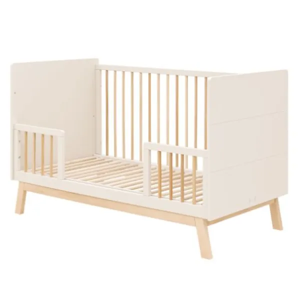 Dit ruime babybed (70 x 140 cm) van de serie Lines van Bopita is om te bouwen van een babybed met spijlen, naar een peuter bedbank zodat de kleine zelf kan in- en uitstappen en hieraan kan wennen.