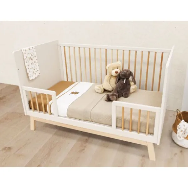 Bedbodem, spijlenrek en lage zijde voor de bedbank worden standaard meegeleverd. De maat, 70 x 140 cm, is hetzelfde voor beide bedden waardoor één matras volstaat. Let op: dit bed is niet om te bouwen naar een cotbed variant, er is altijd één spijlenzijde aanwezig.