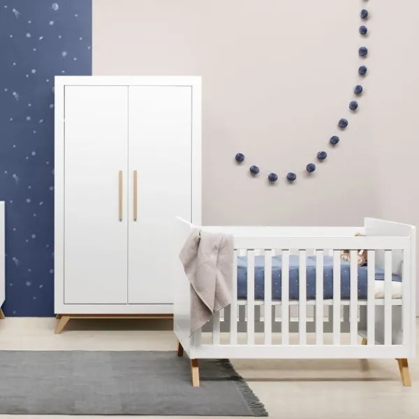 Het onderstel van het modern eigentijds bedje Fenna is een combinatie van wit met blank gelakt hout. De bedbodem is verstelbaar in hoogte, zodra de baby zichzelf kan optrekken kun je de bodem verlagen voor extra veiligheid.