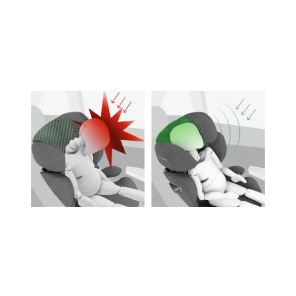De gepatenteerde verstelbare hoofdsteun kantelt het hoofdje van het kind iets naar achteren en helpt zo te voorkomen dat het tijdens het slapen naar voren valt. Dus bij een botsing van opzij is de kans groter dat het hoofdje van je kind zich in een beschermde positie bevindt – zeven keer veiliger dan wanneer het uit de veiligheidszone van het zitje zou vallen