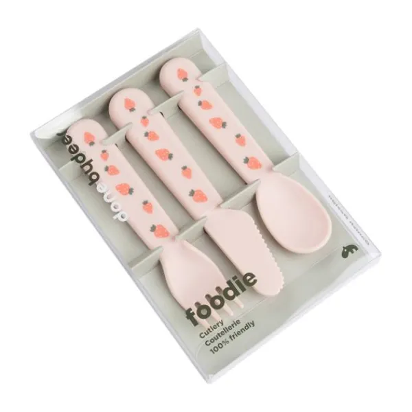 Maak etenstijd extra leuk met het **Done By Deer Tiny Farm Bestek – Powder**! Dit schattige besteksetje is speciaal ontworpen voor kleine handjes en helpt je kindje zelfstandig te leren eten. De set bestaat uit een vork, mes en lepel, allemaal met een speels aardbeienontwerp op het handvat. Dankzij het ergonomische ontwerp ligt het bestek prettig in de hand en is het eenvoudig vast te houden door je kleintje.
