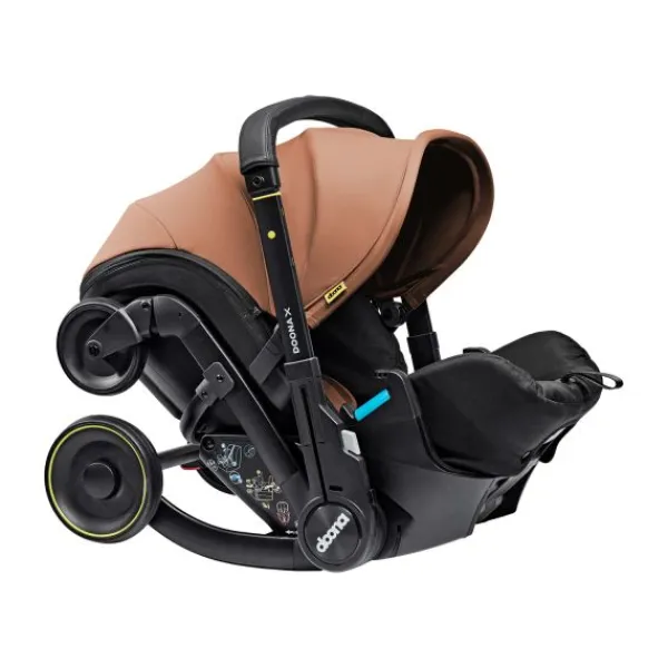 Gebruiksgemak staat centraal bij de Doona X. Met één klik plaats je het autostoeltje op de Isofix base en met hetzelfde gemak transformeer je het tot een wandelwagen – zonder je kindje wakker te maken. De duwstang is traploos verstelbaar via zijknoppen en is afgewerkt met een stijlvolle kunstlederen omslag. Dit maakt de Doona X niet alleen praktisch, maar ook elegant voor dagelijks gebruik.
