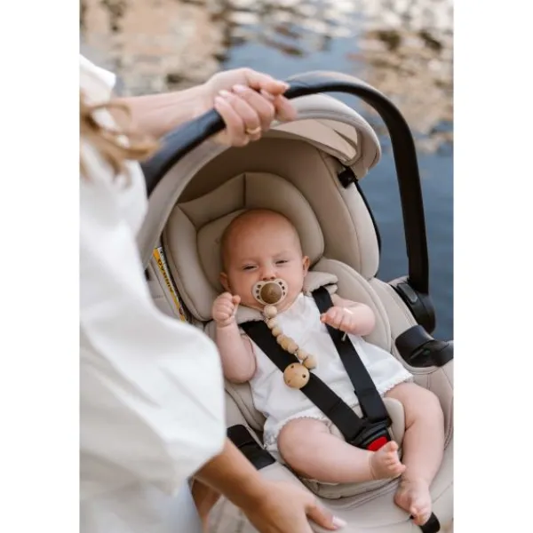 De verstelbare handgreep kun je gemakkelijk naar achteren schuiven om je kind in het autostoeltje te zetten. Druk eenvoudig op de knoppen aan weerszijden van de handgreep om die te ontgrendelen en te verplaatsen. Wanneer het stoeltje op de grond wordt geplaatst, raden wij aan de handgreep volledig terug te klappen, om schommelen te voorkomen.
